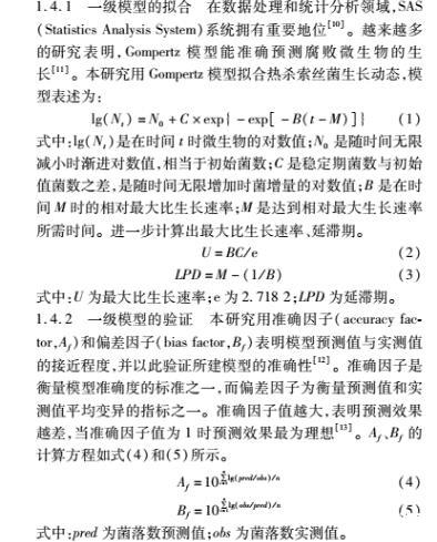 1.3.1一級模型的擬合在數(shù)據(jù)處理和統(tǒng)計分析領(lǐng)域,SAS(Statistics Analysis System)系統(tǒng)擁有重要地位。越來越多的研究表明,Gompertz模型能準(zhǔn)確預(yù)測腐敗微生物的生長。本研究用Gompertz模型擬合熱殺索絲菌生長動態(tài),模型表述為: