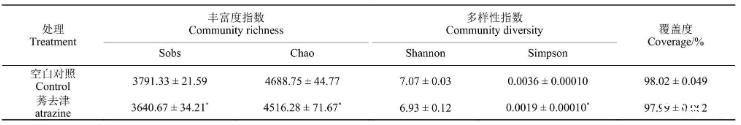 對莠去津脅迫下水稻根際土壤的微生物多樣性進行分析,α多樣性結(jié)果如表1所示。各處理樣本覆蓋度均在98%以上,能較好地覆蓋樣本微生物群落的多數(shù)物種。另外,莠去津脅迫顯著降低了Sobs指數(shù)、Chao指數(shù)和Simpson指數(shù),但對Shannon指數(shù)無顯著影響,表明莠去津脅迫可降低水稻根際土壤中細菌的豐富度和多樣性。