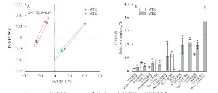 為了分析莠去津?qū)ΩH土壤細菌群落β多樣性的影響,在屬水平上進行了主坐標分析(PCoA)。結(jié)果表明:第一組分(PC1)和第二組分(PC2)的方差貢獻率分別為64.31%和17.7%,累計貢獻率為82.01%(圖1A)。另外,莠去津處理組樣品點和對照組樣品點在二維平面上能完全分開,說明莠去津可影響土壤細菌的群落結(jié)構(gòu)。進一步篩選得到不同處理下存在顯著差異的優(yōu)勢菌屬,結(jié)果如圖1B所示:莠去津處理顯著降低了戴沃斯菌屬(Devosia)、氫孢菌屬(Hydrogenispora)、代爾夫特菌屬(Delftia)的相對豐度,而噬氫菌屬(Hydrogenophaga)、瘤胃梭菌屬(Ruminiclostridium)、鞘氨醇桿菌屬(Sphingobacterium)、假單胞菌屬(Pseudomonas)、金黃桿菌屬(Chryseobacterium)、芽孢桿菌屬(Bacillus)和窄食單胞菌屬(Stenotrophomonas)的相對豐度則顯著增加。
