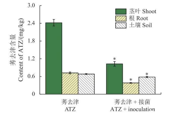 圖3接種Pseudomonas sp.AT2菌株對水稻和土壤中莠去津含量的影響