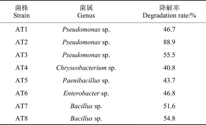 通過分離篩選純化,獲得8株對莠去津具有降解功能的菌株,分別命名為AT1~AT8,對莠去津的體外降解率在40.8%~88.9%之間(表2)。根據(jù)16S rRNA基因序列同源性比對,發(fā)現(xiàn)8株菌株分別隸屬于假單胞菌屬(Pseudomonassp.)、芽孢桿菌屬(Bacillussp.)、類芽孢桿菌屬(Paenibacillussp.)、金黃桿菌屬(Chryseobacteriumsp.)和腸桿菌屬(Enterobactersp.)。以其中降解能力最強的Pseudomonassp.AT2為目標菌株,通過對水稻株高、根長、干重、葉綠素和MDA含量進行測定,評估了接菌和未接菌水稻耐受莠去津脅迫的能力。結(jié)果如表3所示:在莠去津脅迫下,水稻生長明顯受到了抑制,葉綠素含量下降,同時伴隨著MDA含量增加,說明氧化脅迫增強。接種降解菌株AT2后,水稻中MDA含量與單獨莠去津處理組相比顯著下降,表明菌株AT2可緩解莠去津?qū)λ镜难趸{迫損傷。另外,在莠去津脅迫下,接菌處理組水稻的株高、根長、干重和葉綠素含量相較于未接菌組分別增加了34.6%、27.6%、28.6%和76.3%,進一步證明降解菌AT2對莠去津脅迫具有緩解作用。