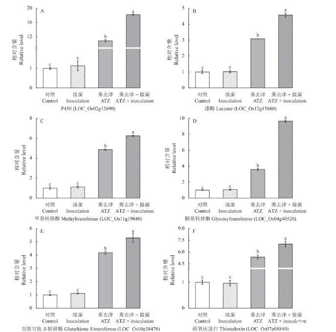 農(nóng)藥在植物中的代謝主要通過三相代謝完成。為評估AT2對水稻中莠去津降解基因表達的影響,從已報道的莠去津降解基因中選擇6個參與I相和II相代謝的關(guān)鍵基因,測定了不同處理下降解基因的表達量。結(jié)果如圖4所示:在無莠去津脅迫情況下,接菌組水稻和未接菌對照組水稻中降解基因的表達量無顯著差異;莠去津脅迫下,水稻的防御系統(tǒng)被激活,莠去津降解基因的表達量顯著增加,其中P450基因的表達量是無莠去津脅迫對照組的10.7倍。另外,莠去津脅迫下,接菌組水稻中莠去津降解基因的表達量明顯高于未接菌組水稻,與未接菌組相比,接菌組水稻中編碼漆酶、甲基轉(zhuǎn)移酶、糖基轉(zhuǎn)移酶、P450、谷胱甘肽S-轉(zhuǎn)移酶和硫氧還蛋白的基因表達量分別提高了1.5、1.3、2.7、1.7、2.5和1.3倍。研究表明,接種降解菌AT2激活了水稻中莠去津的降解基因,從而可促進水稻中莠去津的降解代謝。