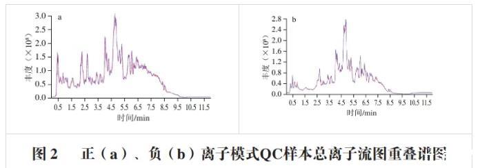為評價儀器的穩(wěn)定性及數據質量的可靠性,分別在正負離子模式下將QC樣本總離子流圖進行譜圖重疊比較,結果如圖2所示。結果表明兩種模式下各色譜峰的響應強度和保留時間均基本重疊,說明在整個實驗過程中儀器誤差引起的變異較小,實驗結果較為可靠。