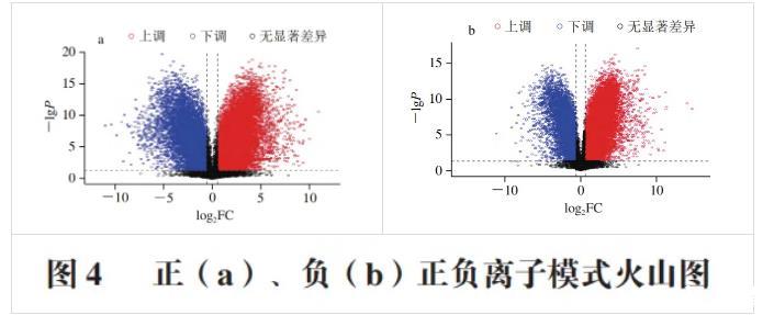 圖5中橢圓代表95%置信區(qū)間,同一顏色的點表示組內的各個生物學重復,由點的分布狀態(tài)可以看出,該模型可以區(qū)分兩組樣本,組間樣本的數據點很好地集中在一起。PCA模型參數R2X越接近1表明模型越可靠,正、負離子模式下的模型解釋率R2X分別為0.835和0.855。結果表明該模型穩(wěn)定可靠,實驗重復性好,隨機誤差較小,可進一步對樣本進行差異性分析。
