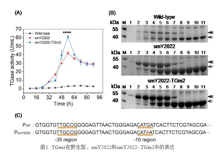 然而,上述研究中TGm2只在大腸桿菌中進(jìn)行少量合成,并不適于工業(yè)化生產(chǎn)。因此,實(shí)現(xiàn)耐熱TGase在食品安全菌株S.mobaraensis中的高效合成十分迫切。