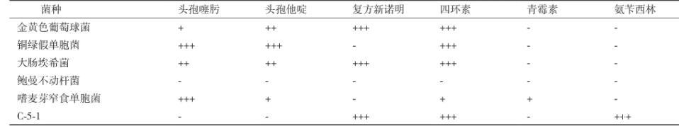表3五種指示菌與側(cè)孢短芽孢桿菌C-5-1的藥敏分析