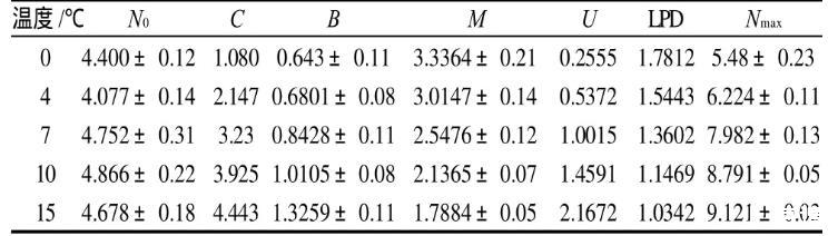 Gompertz方程是一個雙指數(shù)函數(shù),被認(rèn)為是較為準(zhǔn)確擬合微生物生長的一級模型。運(yùn)用SAS軟件擬合不同恒定溫度下冷鮮肉中熱殺索絲菌的生長。由表2可以看出,判定系數(shù)R2的值較高,并且隨溫度升高R2值逐漸增加,表明Gompertz模型能很好的描述不同溫度下熱殺索絲菌的生長,尤其對較高溫度的擬合更為理想。利用Gompertz模型求得的熱殺索絲菌生長動力學(xué)參數(shù)見表3,可以看出0、4℃時最大比生長速率較低,延滯期較長,熱殺索絲菌的生長處于抑制狀態(tài),當(dāng)溫度升高到15℃時比生長速率急劇增加,延滯期縮短為1.034d。