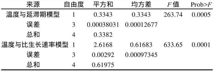 用平方根模型擬合溫度對微生物生長的影響。圖2是應(yīng)用平方根模型擬合溫度與比生長速率的關(guān)系。圖3是應(yīng)用平方根模型擬合溫度與延滯期的關(guān)系。用F統(tǒng)計量檢驗?zāi)P涂傮w的顯著性,表4為模型的方差分析結(jié)果??芍獪囟扰c比生長速率和延滯期之間存在良好的線性關(guān)系,溫度作為影響微生物生長的柵欄因子具有重要的實(shí)際意義。溫度與比生長速率的模型為方程(5),溫度與延滯期的模型為方程(6)。