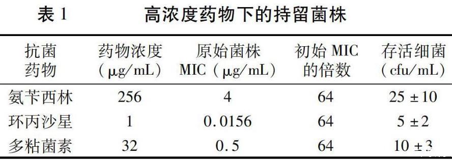 在高藥物濃度的培養(yǎng)條件(氨芐西林256μg/mL,環(huán)丙沙星1μg/mL,多粘菌素32μg/mL)下,持續(xù)作用6 d,依然能夠檢測到存活的細(xì)菌。按照接種量104 cfu/mL數(shù)量級計(jì)算,存活率在0.1%左右(表1)。此試驗(yàn)結(jié)果表明,即使在有限的空間內(nèi),只要初始接種量達(dá)到一定數(shù)量,高于致死濃度的抗菌藥物并不能完全殺死細(xì)菌,總會(huì)有一小部分細(xì)菌存活下來。