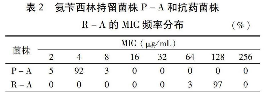 在藥物氨芐西林濃度為256μg/mL條件下,先后共收集存活的細(xì)菌134株,測定其MIC,90%以上的菌株與原始菌株持平,少數(shù)略高于原始菌株一個(gè)或兩個(gè)梯度,均遠(yuǎn)遠(yuǎn)低于其生存環(huán)境的藥物濃度。環(huán)丙沙星和多粘菌素作用下的群體也存在同樣的現(xiàn)象(數(shù)據(jù)略)。這些在高濃度藥物作用下存活的細(xì)菌,其MIC卻保持不變,為持留菌。致死量的抗菌藥物不能將其殺滅,說明持留菌通過某種機(jī)制耐過了高濃度的藥物,并且保持了原有的藥物敏感特性。隨機(jī)選取其中一株氨芐西林的持留菌,在氨芐西林濃度為256μg/mL的環(huán)境中得以存活,測定其分裂繁殖的后代實(shí)際MIC為4μg/mL,經(jīng)傳代后MIC保持不變,命名為菌株P(guān)-A,是原始菌株持留菌株繁殖后代的純培養(yǎng)。