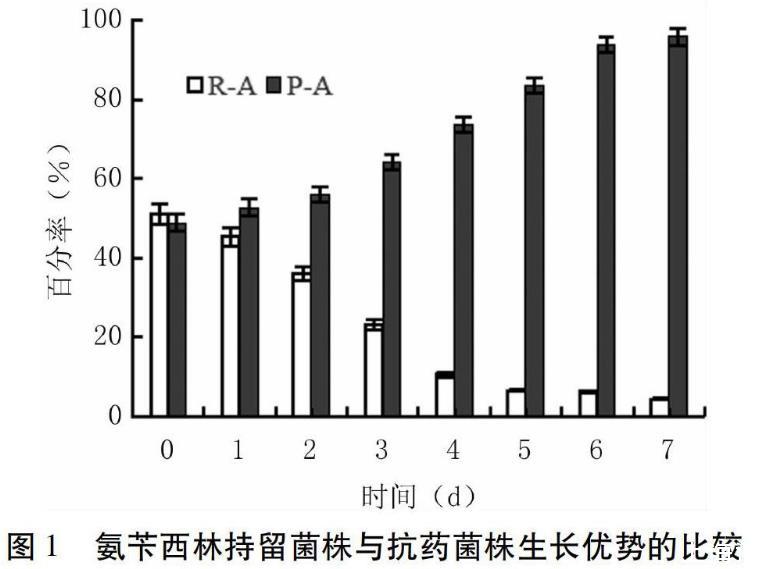 氨芐西林處理的P-A和R-A菌株MIC范圍無相互交叉,將二者等比例混合接種培養(yǎng),根據(jù)穩(wěn)定的MIC范圍統(tǒng)計(jì)其比例變化。如圖1所示,混合培養(yǎng)后,持留菌株P(guān)-A所占比例逐漸升高,到第4 d增至70%以上,至第7 d抗藥菌株R-A比例低于5%,菌株P(guān)-A數(shù)量占絕對優(yōu)勢。此結(jié)果表明,在沒有藥物的培養(yǎng)條件下,P-A具有更強(qiáng)的生長優(yōu)勢。隨機(jī)挑選氨芐西林作用下存活的其它持留菌株和抗藥菌株,用同樣的方法對比其生長優(yōu)勢,也有類似的結(jié)果(數(shù)據(jù)略)。另外兩種藥物環(huán)丙沙星和多粘菌素的持留菌株和抗藥菌株,生長優(yōu)勢的比較也存在類似結(jié)果(數(shù)據(jù)略),最終都能體現(xiàn)出持留菌株具有更強(qiáng)的生長優(yōu)勢。本研究中共檢測8組菌株的對比,未檢測到例外情況。