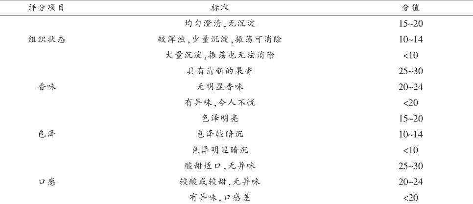 對(duì)果汁感官鑒定的方法,制訂表1中鮮榨橙汁的評(píng)分標(biāo)準(zhǔn),選擇10名食品專業(yè)的學(xué)生分別從氣味、色澤、口感、狀態(tài)4個(gè)方面對(duì)橙汁進(jìn)行感官評(píng)價(jià),總分為100分。
