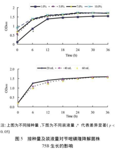 圖5接種量及裝液量對芐嘧磺隆降解菌株75B生長的影響