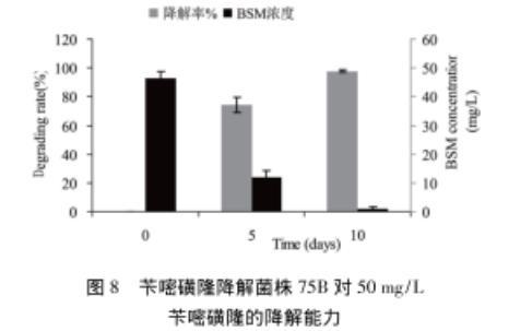 圖8芐嘧磺隆降解菌株75B對50 mg/L芐嘧磺隆的降解能力