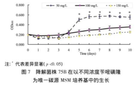 圖7降解菌株75B在以不同濃度芐嘧磺隆為唯一碳源MSM培養(yǎng)基中的生長