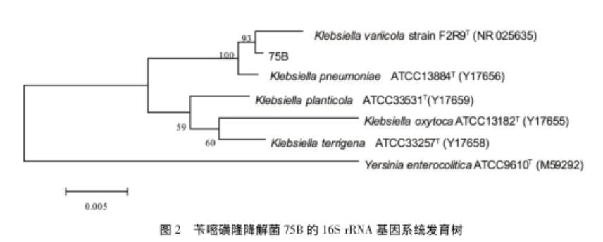 利用16S rRNA基因擴增的通用引物,以75B菌株的總DNA為模板進行PCR擴增,擴增產(chǎn)物經(jīng)電泳顯示擴增到1.5 kb大小目的條帶。測序產(chǎn)物經(jīng)BLAST及EzTaxon-e服務器鑒定,構建系統(tǒng)發(fā)育樹(圖2),表明75B菌株的16S rRNA基因與Klebsiellavariicola及Klebsiellapneumoniae同源性極高,分子鑒定為Klebsiellasp.。