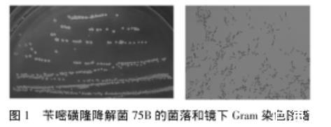 圖1芐嘧磺隆降解菌75B的菌落和鏡下Gram染色圖譜