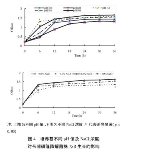 圖4培養(yǎng)基不同pH值及NaCl濃度對芐嘧磺隆降解菌株75B生長的影響