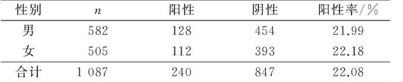 1 087例肺炎患兒的咽拭子標本中MP培養(yǎng)陽性240例(240株),陽性率為22.08%。其中男性患兒MP陽性率為21.99%,女性患兒MP陽性率為22.18%,男女間比較差異無統(tǒng)計學意義(P>0.05)。見表1。