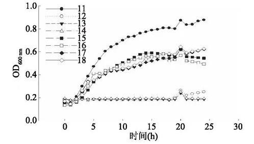 注:11:對照組乙型副傷寒沙門氏菌的生長曲線;12:WBL-45濃度2處理的乙型副傷寒沙門氏菌(WBL-45終濃度為30 mL/100 mL)的生長曲線(WBL45-30 mL/100 mL);13:VHI41-30 mL/100 mL;14:LS-30 mL/100 mL;15:CK-30 mL/100 mL;16:用濃度1的WBL-45處理的乙型副傷寒沙門氏菌的生長曲線(WBL45-IC50);17:VHI41-IC50;18:LS-IC50。