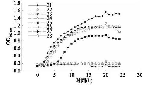注:21:對照組金黃色葡萄球菌的生長曲線;22:WBL-45濃度2處理的金黃色葡萄球菌(WBL-45終濃度為30 mL/100 mL)的生長曲線(WBL45-30 mL/100 mL);23:VHI41-30 mL/100 mL;24:LS-30 mL/100 mL;25:CK-30 mL/100 mL;26:用濃度1的WBL-45處理的金黃色葡萄球菌的生長曲線(WBL45-IC50);27:VHI41-IC50;28:LS-IC50。