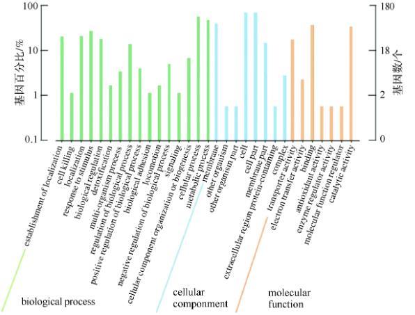 經過GO功能注釋分析(圖2)發(fā)現(xiàn),差異基因在基因的分子功能方面主要集中在分子轉運、抗氧化、酶調節(jié)、轉錄因子活性等;在所處的細胞位置方面主要集中在細胞膜、細胞器、含蛋白質分子混合物等;在參與的生物過程方面主要集中在對刺激的反應、細胞殺傷、生化代謝等。