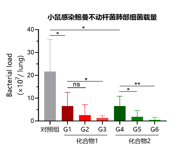 與對(duì)照組相比,化合物1和化合物2均能顯著降低鮑曼不動(dòng)桿菌感染后小鼠肺部的細(xì)菌載量(P<0.05),且這種治療效果具有劑量依賴效應(yīng)。在不同劑量的化合物1和化合物2中,高劑量化合物2(G6)的治療效果最好(P<0.01)。