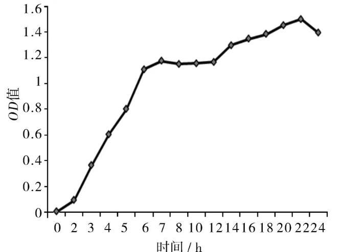 根據(jù)0、2、3、4、5、6、8、10、12、16、18、20、24 h所測(cè)的菌液的OD值結(jié)果,取每組的平均值,繪制菌株OD值隨時(shí)間變化的關(guān)系圖(如圖1)??煽闯鲈摼?~6 h進(jìn)入對(duì)數(shù)期,對(duì)數(shù)期時(shí)間較早,22 h后就進(jìn)入了穩(wěn)定期。