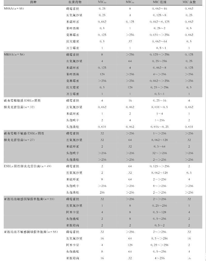 除萬古霉素,磷霉素鈉及其他對照藥對耐甲氧西林金黃色葡萄球菌(methicillin-resistantStaphylococcusaureus,MRSA)的抗菌作用均較甲氧西林敏感金黃色葡萄球菌(methicillin-susceptibleStaphylococcusaureus,MSSA)有所下降。對于碳青霉烯類抗生素敏感且不產(chǎn)超廣譜β-內(nèi)酰胺酶(extended-spectrumβ-lactamases,ESBLs)肺炎克雷伯菌,磷霉素和對照藥均顯示出很好的體外抗菌活性。對于碳青霉烯類抗生素不敏感和ESBLs陽性菌株,頭孢呋辛和頭孢曲松均高度耐藥,但磷霉素仍表現(xiàn)出一定抗菌活性,MIC50≤32 mg/L。對于銅綠假單胞菌,磷霉素對亞胺培南敏感或不敏感菌株的抗菌作用基本一致,但對照藥均受亞胺培南敏感性下降影響,對亞胺培南不敏感菌的抗菌活性低于敏感菌株。見表1。