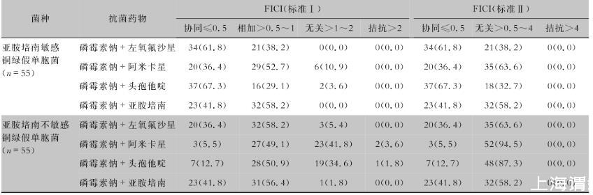 對于聯(lián)合藥敏結果的判定,以往常用標準Ⅰ,即協(xié)同、相加、無關和拮抗4段法。但考慮到MIC測定為二倍稀釋法,同一株細菌的MIC值不同次測定時可能出現(xiàn)±1個稀釋度的變化,因而,近年來國外較推崇標準Ⅱ,即協(xié)同、無關和拮抗3段法。本研究中將兩種判定結果均展示以供比較。已有的聯(lián)合藥敏報道顯示,研究者通常關注的是協(xié)同率與拮抗率,而兩種判定中協(xié)同標準是一致的,因此不同標準對最終定性影響不大。