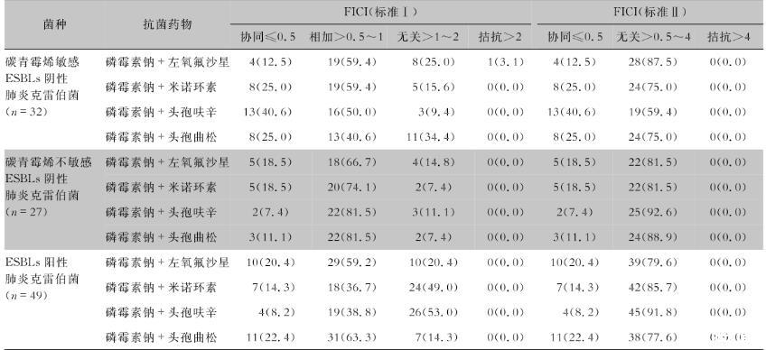 表3磷霉素鈉體外聯(lián)合其他藥物對肺炎克雷伯菌和銅綠假單胞菌的藥敏結果[株數(shù)(%)]