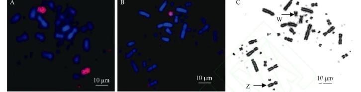 朱鹮性染色體鑒別在以前的研究中,通過(guò)流式分選,我們已獲得了石鸻(B.oedicnemus,鸻形目)的Z和W染色體特異探針(Nie et al,2009)。為準(zhǔn)確鑒別朱鹮的性染色體,特別是W染色體,我們利用石鸻的Z和W染色體特異探針,分別與雄、雌性朱鹮的中期分裂相進(jìn)行熒光原位雜交(圖6A,B)。在雄性朱鹮的中期分裂相中,石鸻的Z染色體探針涂染了一對(duì)中著絲粒染色體(圖6A),即Z染色體,與核型分析確定的Z染色體一致。在雌性朱鹮的中期分裂相中,石鸻的W染色體探針涂染了一條較小的亞端著絲粒染色體(圖6B),直接證明W染色體是一條較小的亞端著絲粒染色體(圖6C)。另外,石鸻的Z和W染色體探針?lè)謩e在朱鹮的一對(duì)微小染色體和Z染色體長(zhǎng)臂的末端有交叉雜交的信號(hào)。這種交叉雜交的信號(hào),在以石鸻的Z和W染色體探針與家雞的中期分裂相進(jìn)行熒光原位雜交的實(shí)驗(yàn)中也曾被檢測(cè)到(Nie et al,2009),表明石鸻的Z和W染色體探針中包含有與被雜交的染色體同源的序列,這些同源的序列可能是重復(fù)序列。