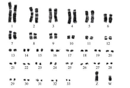 帶型分析目前,有關(guān)朱鹮顯帶染色體未見(jiàn)報(bào)道。在本研究中,我們首次進(jìn)行了朱鹮染色體Ag帶、C帶(圖4C,D)和G帶(圖5)顯示。在所觀察的20個(gè)細(xì)胞中,銀染的核仁組織者區(qū)(nucleolar organizer region,NOR)分布在一對(duì)微小染色體上(圖4C,箭頭所示)。C帶(異染色質(zhì))主要分布在多數(shù)大染色體的著絲粒區(qū)域,微小染色體多為C帶陽(yáng)性,表明其微小染色體含有豐富的異染色質(zhì)。W染色體和Z染色體的長(zhǎng)臂末端均為C帶陽(yáng)性(圖4D,箭頭所示)。朱鹮的染色體C帶與已報(bào)道的家雞的染色體C帶相似(Pollock&Fechheimer,1981)。圖5為朱鹮的G帶核型圖,染色體排列方式參照Liu et al(1992)的報(bào)道,按染色體的相對(duì)長(zhǎng)度,從長(zhǎng)到短進(jìn)行排列。G帶分析結(jié)果表明,除雌性性染色體為異配的ZW以及雄性性染色體為同配的ZZ外,雌、雄個(gè)體的G帶核型一致;Z染色體為中著絲粒染色體,相對(duì)長(zhǎng)度僅次于第5號(hào)染色體;W染色體長(zhǎng)度約為Z染色體的一半。這些結(jié)果與Liu et al(1992)的報(bào)道一致。雖然可以根據(jù)性染色體為同配或異配來(lái)鑒別鳥(niǎo)類(lèi)的性別,但鳥(niǎo)類(lèi)的W染色體較小,長(zhǎng)度與一些較小的常染色體相當(dāng),因此,在常規(guī)染色的分裂相中,僅根據(jù)外形,很難準(zhǔn)確鑒別W染色體(Shields,1982)。對(duì)于朱鹮W染色體的形態(tài),Takasi&Sasaki(1974)的報(bào)道為亞端著絲粒染色體,Liu et al(1992)認(rèn)為是中著絲粒染色體,而我們的G帶核型分析支持其為亞端著絲粒染色體(圖5)。
