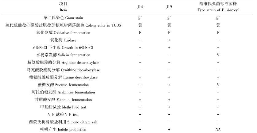 對菌株J14和J19進行形態(tài)、常規(guī)生理生化鑒定,結(jié)果顯示,2個菌株均為革蘭氏陰性細菌,硫代硫酸鹽檸檬酸鹽膽鹽蔗糖瓊脂培養(yǎng)基平板上呈黃色,生理生化鑒定結(jié)果與哈維氏弧菌特征極為相近。與標準菌株比較,部分鑒定項存在差異,推測2個菌株可能為哈維氏弧菌。對菌株J14和J19進行16S rRNA基因分子生物學鑒定,構(gòu)建的系統(tǒng)發(fā)育樹顯示,2株菌與哈維氏弧菌聚為一支。綜合生理生化與分子生物學鑒定結(jié)果,確定這2個菌株均為哈維氏弧菌。