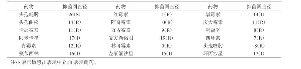18種藥品對PM-XNR進行藥敏試驗,其中該菌株P(guān)M-XNR對頭孢抗生素頭孢吡肟敏感,對阿米卡星、氨芐西林、左氧氟沙星、氯霉素和環(huán)丙沙星中度敏感;對其他使用的抗生素均耐藥。說明犬源奇異變形桿菌具有較強的耐藥性。
