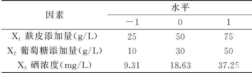 1.2.3 Box-Behnken design優(yōu)化粗毛纖孔菌菌絲富硒培養(yǎng)基配方為考察培養(yǎng)基各成分與外源硒對粗毛纖孔菌菌絲生長的影響及其之間的交互效應,以單因素實驗結果為依據(jù),以粗毛纖孔菌菌絲生長速度為指標(Y),在最適pH條件下,采用Box-Behnken模型設計三因素、三水平組合實驗(表1),對結果進行響應面分析,得到最優(yōu)響應Y值,從而得到最佳富硒粗毛纖孔菌菌絲培養(yǎng)基配方。
