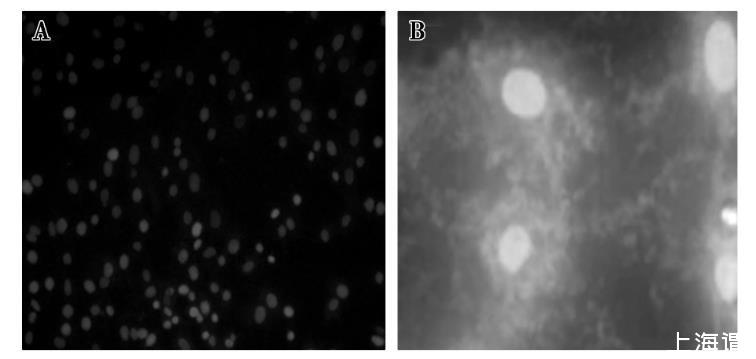 實驗采用Hoechst 33342 DNA熒光染色法,未檢查到撒壩豬成纖維細胞被支原體污染。實驗組細胞經(jīng)Hoechst33342熒光染色后,僅細胞核顯色,細胞表面及細胞周圍干凈、清晰,無熒光小點。如圖5 A所示。陽性對照組經(jīng)Hoechst33342熒光染色后,可見細胞核與細胞膜及其周圍均可見散在的藍色熒光顆粒所圖5 B所示。證明我實驗室建立的撒壩豬成纖維細胞系支原體檢測呈陰性。