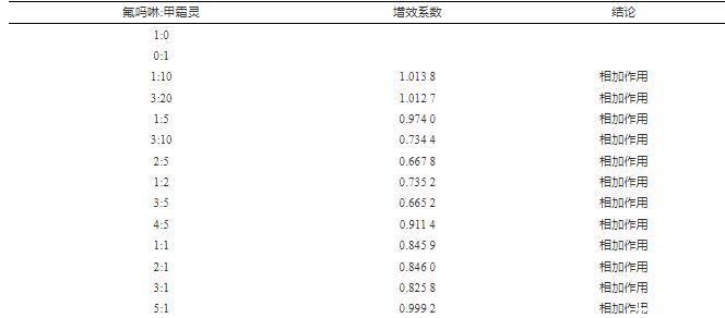 將理論抑制率與實(shí)際抑制率相比較,如果理論值<實(shí)際值,表示兩者在復(fù)配時(shí)存在增效作用;若理論值=實(shí)際值,表示兩者為相加作用;若理論值>實(shí)際值,則表示兩者復(fù)配時(shí)存在拮抗作用。