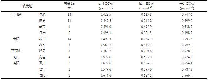 表1河南省不同地區(qū)煙草黑脛病菌對(duì)氟嗎啉的敏感性比較