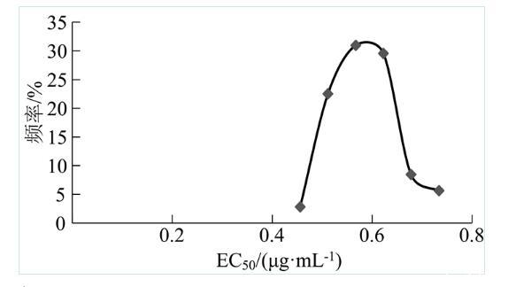 從河南省11個(gè)地區(qū)共分離獲得71株煙草黑脛病菌,藥劑敏感性結(jié)果(表1)表明,氟嗎啉對(duì)所有供試菌株的EC50值在0.428 5~0.760 8μg/mL,最大的EC50值與最小的EC50值之間相差1.78倍,平均EC50值為0.588 4μg/mL,表明來(lái)自河南省不同地區(qū)的煙草黑脛病菌對(duì)氟嗎啉的敏感性差異不大。其中,平均EC50值最低的菌株來(lái)自盧氏,為0.498 7μg/mL,平均EC50值最高的菌株來(lái)自汝陽(yáng),為0.666 1μg/mL,來(lái)自其他地區(qū)菌株的EC50值居于兩者之間。71株菌株對(duì)氟嗎啉的敏感性頻率分布呈連續(xù)單峰曲線(圖1),表明供試菌株對(duì)氟嗎啉敏感,未出現(xiàn)抗藥性亞群體。