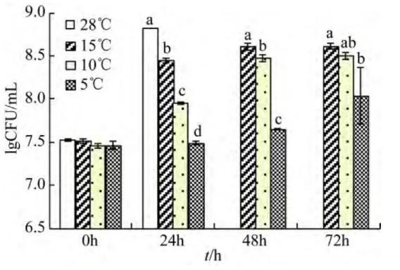 圖3殺鮭氣單胞菌在不同溫度下培養(yǎng)24、48、72h的細菌對數值
