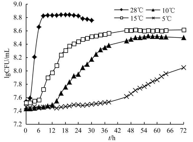 取1.3.1中所述種子液,按5%接種量接種于300 mL無菌LB液體培養(yǎng)基中,充分搖勻后分裝成3份,于28℃下靜置培養(yǎng),每隔2 h取樣,以無菌LB液體培養(yǎng)基作對照,用紫外分光光度計檢測菌液A600值,同時另取菌液進行梯度稀釋,于2216E瓊脂平板涂布計數,統計數據,繪制其在該溫度下的生長曲線。其他溫度(15、10、5℃)梯度條件下實驗方法類同。