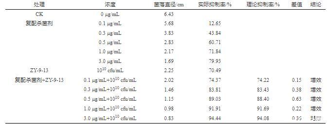 表4化學(xué)復(fù)配藥劑與ZY-9-13協(xié)同作用對煙草黑脛病菌菌絲生長的抑制效果