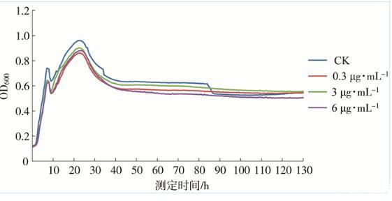 圖2可見,在無藥對照和各濃度藥液處理后,解淀粉芽孢桿菌ZY-9-13的OD值均呈先升高后降低最后趨于平緩的趨勢,即ZY-9-13先快速生長,在培養(yǎng)22 h時達到最大,隨后生長減緩,逐步衰亡進入平臺期。這種生長趨勢不受藥劑處理的影響,表明化學(xué)復(fù)配藥劑對解淀粉芽孢桿菌無明顯抑制作用,兩者具有良好的相容性。