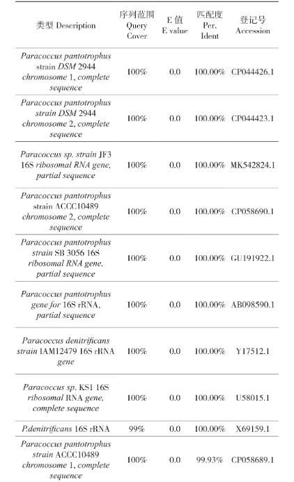 對(duì)目標(biāo)硝化菌A1進(jìn)行16S rDNA測(cè)序分析,發(fā)現(xiàn)與泛養(yǎng)副球菌(Paracoccus pantotrophus)DSM 2944的1號(hào)染色體完整序列相似性水平達(dá)到100%。結(jié)合硝化菌的形態(tài)學(xué)特征及菌種鑒定結(jié)果,確定其為泛養(yǎng)副球菌(Paracoccus pantotrophus),見表2。