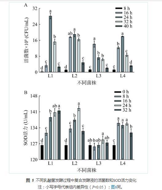 注:大寫(xiě)字母代表SOD的組內(nèi)差異性(P<0.05),小寫(xiě)字母代表活菌數(shù)的組內(nèi)差異性(P<0.05);圖3同。