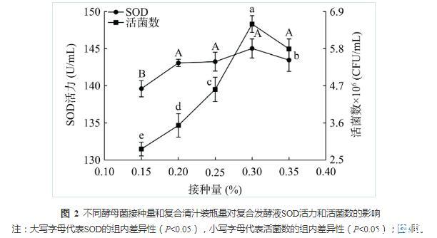 圖2不同酵母菌接種量和復(fù)合清汁裝瓶量對(duì)復(fù)合發(fā)酵液SOD活力和活菌數(shù)的影響