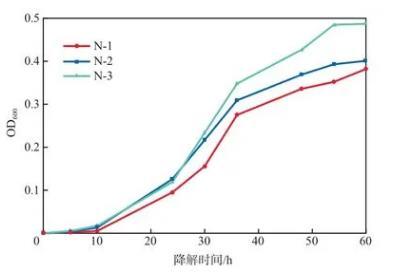圖1 3株萘降解菌在萘選擇性培養(yǎng)基中的生長曲線