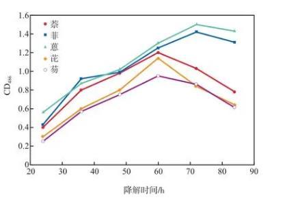 菌株N-3在不同PAHs體系中的脫氫酶活性見圖6。由圖6可見:菌株N-3在所有PAHs體系中的OD486都是先增大后減?。辉诜坪洼祗w系中,菌株N-3的脫氫酶活性在前72 h上升迅速,而后略有下降;在萘、芘和芴體系中,菌株N-3的脫氫酶活性在前60 h上升迅速,而后呈下降趨勢,總體均低于菲和蒽體系中的脫氫酶活性。這表明該菌株對萘、芘和芴的降解能力沒有對菲和蒽的降解能力強。該結(jié)果與菌株N-3對不同PAHs降解率的結(jié)果呈正相關(guān)性,由此也可證明用脫氫酶活性表征微生物對有機污染物的降解能力是一種可靠的方法。