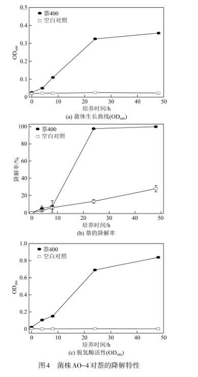脫氫酶活性[圖4(c)]在前8h升高比較緩慢,8~24h迅速升高,在24h后仍有緩慢增長(zhǎng)的趨勢(shì)。PAHs的降解是基于PAHs的氧化,降解過程中脫氫酶可以使PAHs的氫原子活化并轉(zhuǎn)移至特定的受氫體,使PAHs被氧化。脫氫酶活性可在一定程度上反應(yīng)微生物對(duì)有機(jī)污染物的氧化降解能力。以上結(jié)果表明菌株AO-4可有效利用400mg/L萘作為碳源生長(zhǎng),菌體的脫氫酶活性,菌株生長(zhǎng)情況與萘的降解率表現(xiàn)出正相關(guān)。